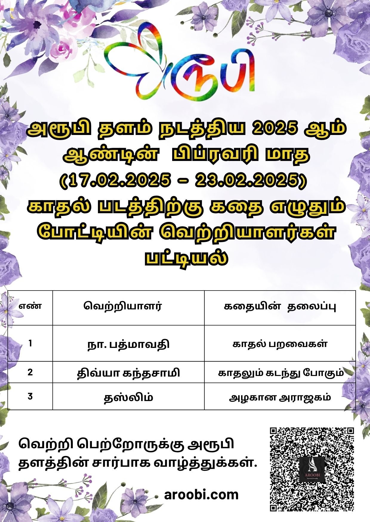 அறிவிப்புகள்மாதப்போட்டி வெற்றியாளர்வெற்றியாளர் அறிவிப்பு: காதல் படத்திற்கு கதை by Nirmal July 9, 2025 written by Nirmal July 9, 2025 78 views அரூபி தள வாசகர்கள் அனைவருக்கும் வணக்கம்!2025 ஆம் ஆண்டின் பிப்ரவரி மாதத்தில் நடத்தப்பட்ட, காதல் படத்திற்கு கதை எழுதும் போட்டியின் வெற்றியாளர்கள் பட்டியல் இதோ! 🎉2025 Kathal Padathirku Kathai Eluthum Competition – Winner Listவெற்றி பெற்றோருக்கும் கலந்து கொண்டோருக்கும் அரூபி தளத்தின் வாழ்த்துக்கள்!போட்டியில் படைக்கப்பட்ட கதைகளை படிக்க லிங்கை சொடுக்கவும்.அரூபி தளத்தில் நடக்கின்ற போட்டிகளில் கலந்துக் கொள்ள, குழுவில் இணைந்திடுங்கள். 🔗Aroobi Competition Groupநன்றி! வணக்கம்! 0 comment 0 FacebookTwitterPinterestEmail Nirmal previous post தமிழ் வளர்ப்போம் : பழமொழி next post தெரிஞ்சிப்போம் வாங்க: மல்லிகை You may also like போட்டியின் தலைப்பு: பயணம் August 31, 2025 போட்டி அறிவிப்பு: கடவுளிடம் ஐந்து கேள்விகள் July 8, 2025 போட்டியின் தலைப்பு: செவ்வான வனம் June 19, 2025 போட்டி அறிவிப்பு: மாய புத்தகம் June 1, 2025 போட்டியின் தலைப்பு: பைரட்ஸ் மே May 19, 2025 ஒரு நாள் கதை போட்டியின் வெற்றியாளர்கள் அறிவிப்பு May 19, 2025 போட்டியின் தலைப்பு: பஞ்சபூதங்களின் ஏப்ரல்! April 26, 2025 அறிவிப்பு: வஞ்சி சொல்லும் கதை போட்டி! March 7, 2025 மெய் எழுத்து கதை போட்டியின் வெற்றியாளர் அறிவிப்பு! February 28, 2025 போட்டியின் தலைப்பு: பாலியல் பேசும் மார்ச்! February 28, 2025Leave a Comment Cancel ReplyYou must be logged in to post a comment.